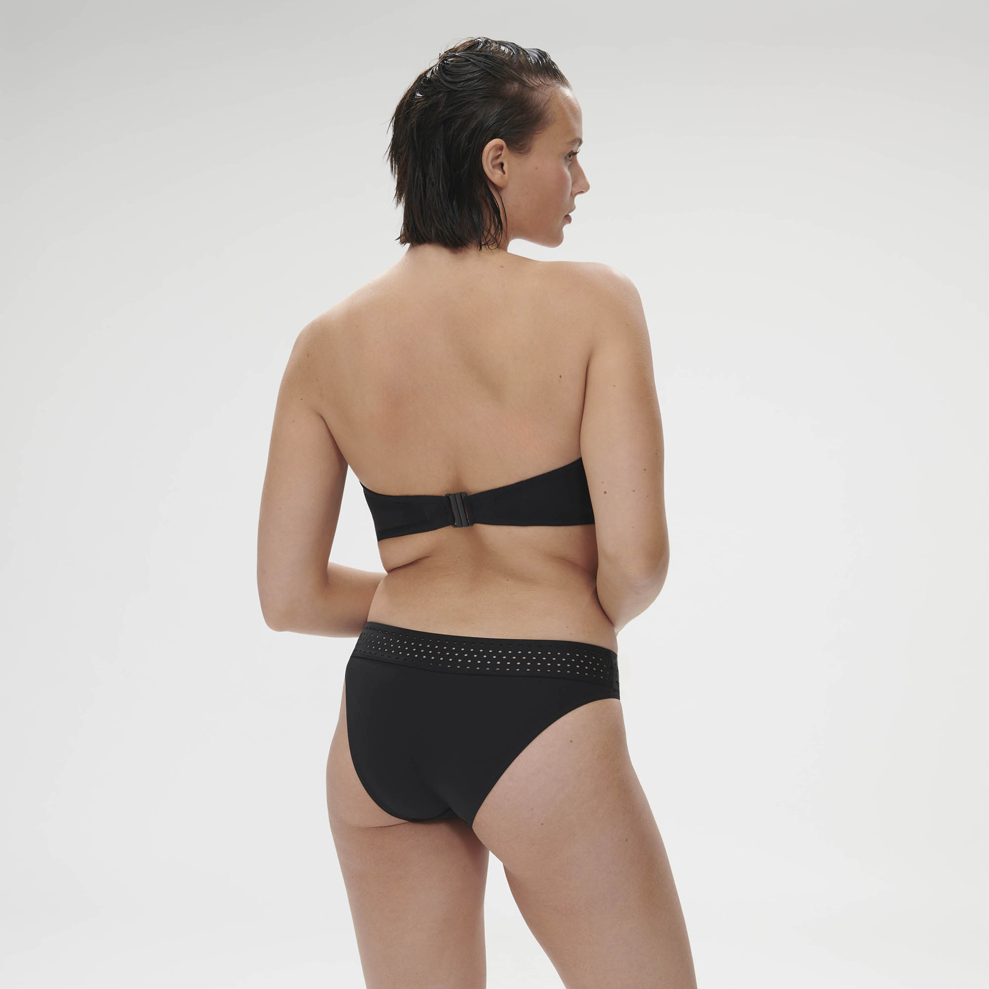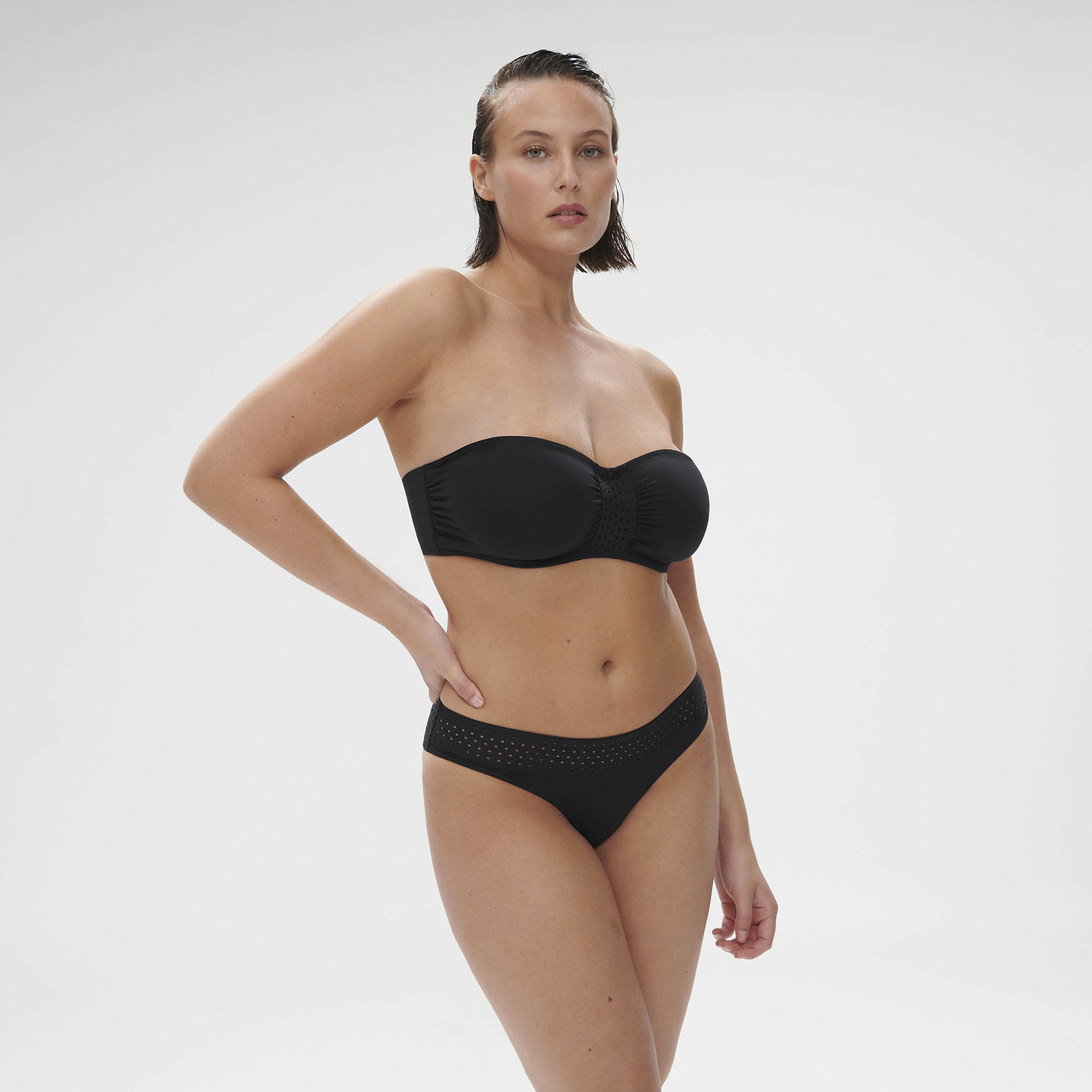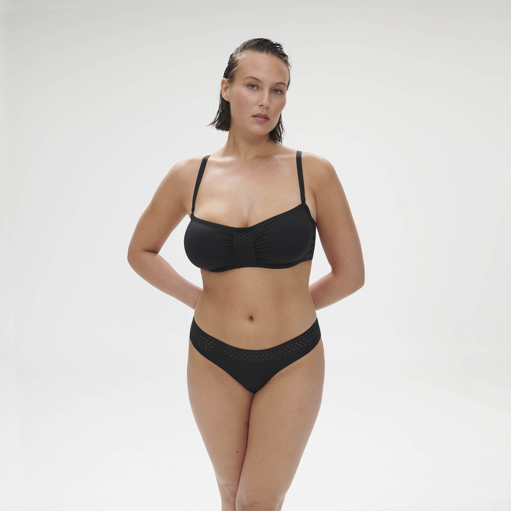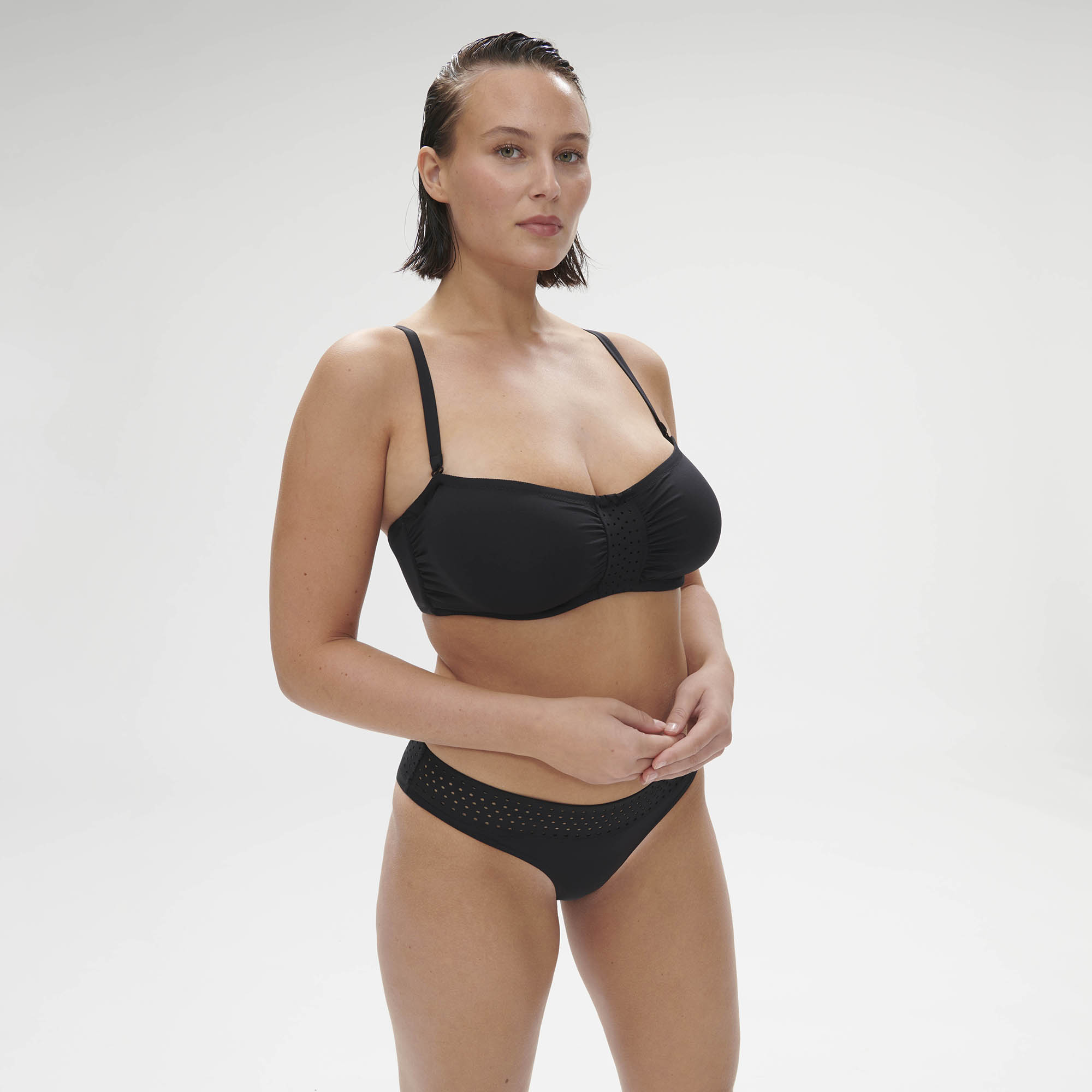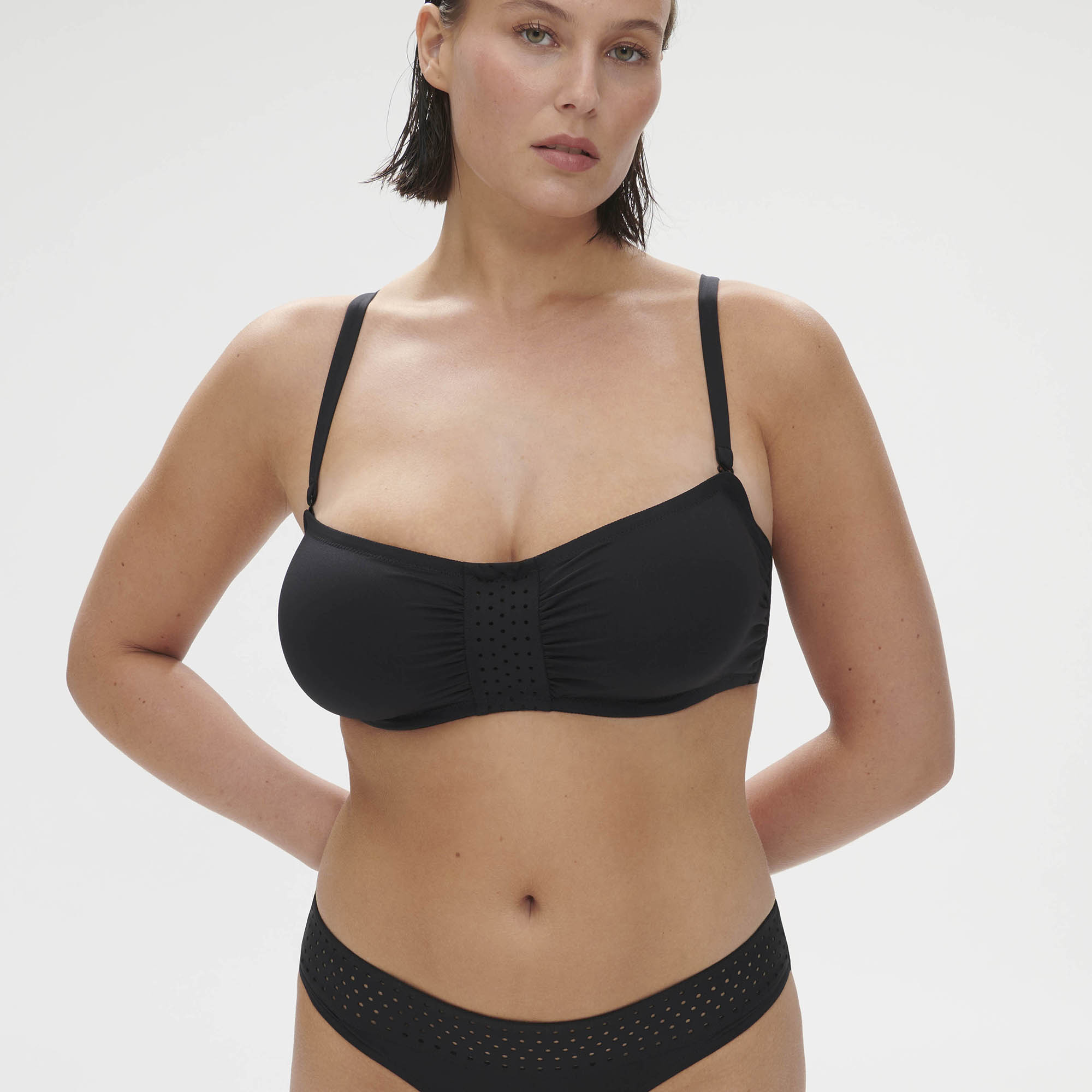 - Ozdobný dierovaný opasok v strede podprsenky a jemné riasenie látky na stranách av strede je efektný detail.